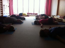 Im Anschluss an die körperliche Praxis folgt Entspannung/ Meditation in Savasana (der liegenden Position).
